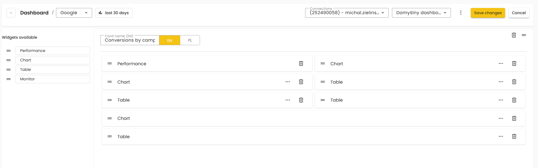 A dashboard is an interactive interface that allows for the visual presentation of results from connected data sources such as Google, Facebook, or Microsoft. The displayed information is organized into charts, tables, Key Performance Indicators (KPIs), and other visual elements, making data interpretation easier and more intuitive.