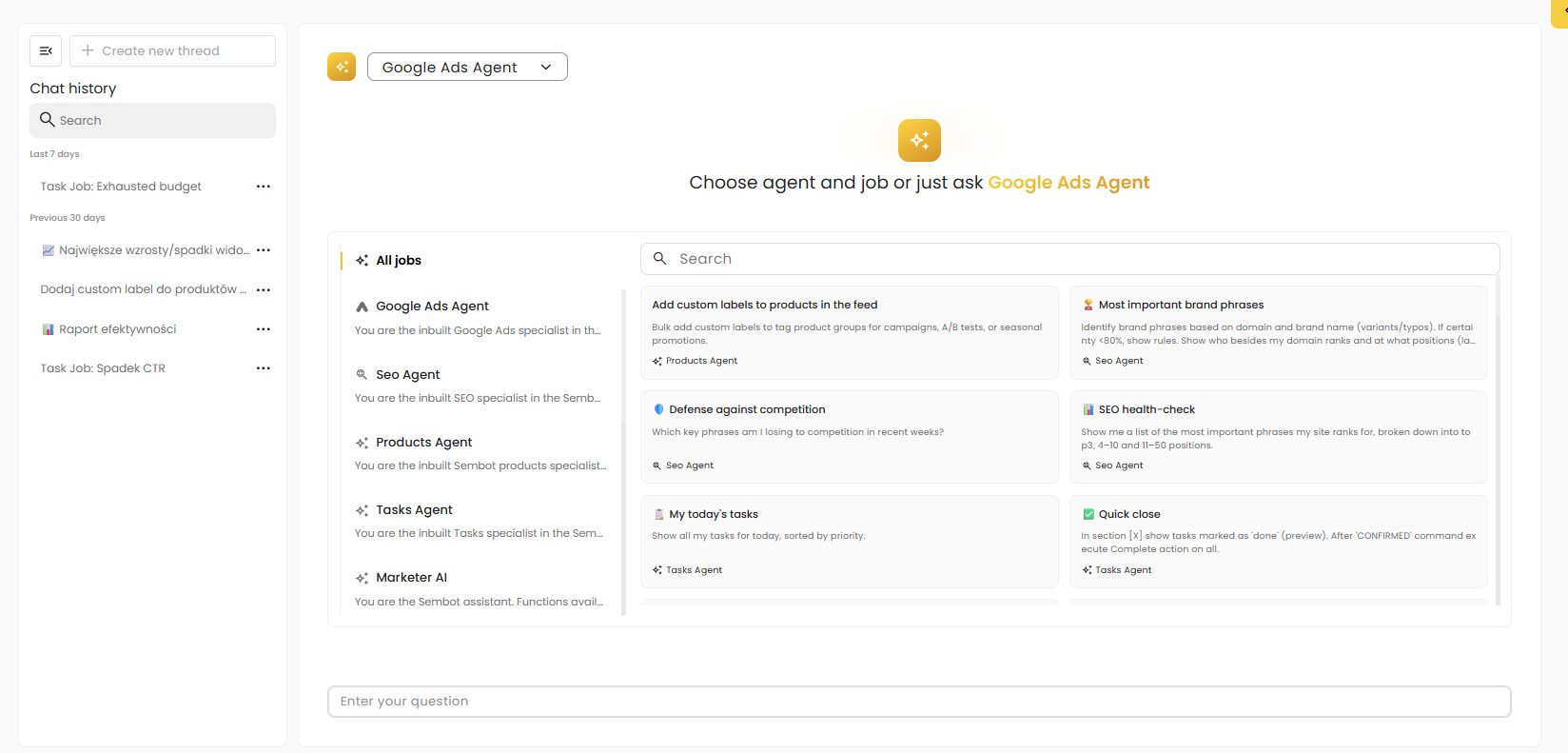 Marketer AI is an advanced AI-powered tool that works as an interactive chat, supporting marketers in their day-to-day tasks. Thanks to integration with the entire Sembot system including the Knowledge Base, the product file, and connected data sources Marketer AI can analyze available information in one place, provide accurate answers, support decision-making, and suggest next steps based on the collected data and context.