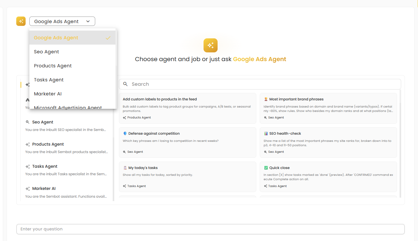 Within Marketer AI, the AI Agents section allows you to select a specialized assistant aligned with the topic of the conversation. This enables users to interact with an agent that has dedicated capabilities and context for a specific area of online marketing (e.g., advertising campaigns, SEO).