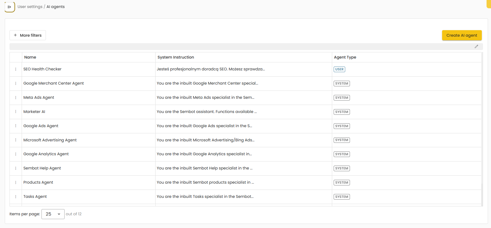 In the AI Agents list module, users have access to a ready-to-use set of system agents that support everyday online marketing work. Each agent specializes in a different area, making it easy to use targeted assistance exactly where it is needed.