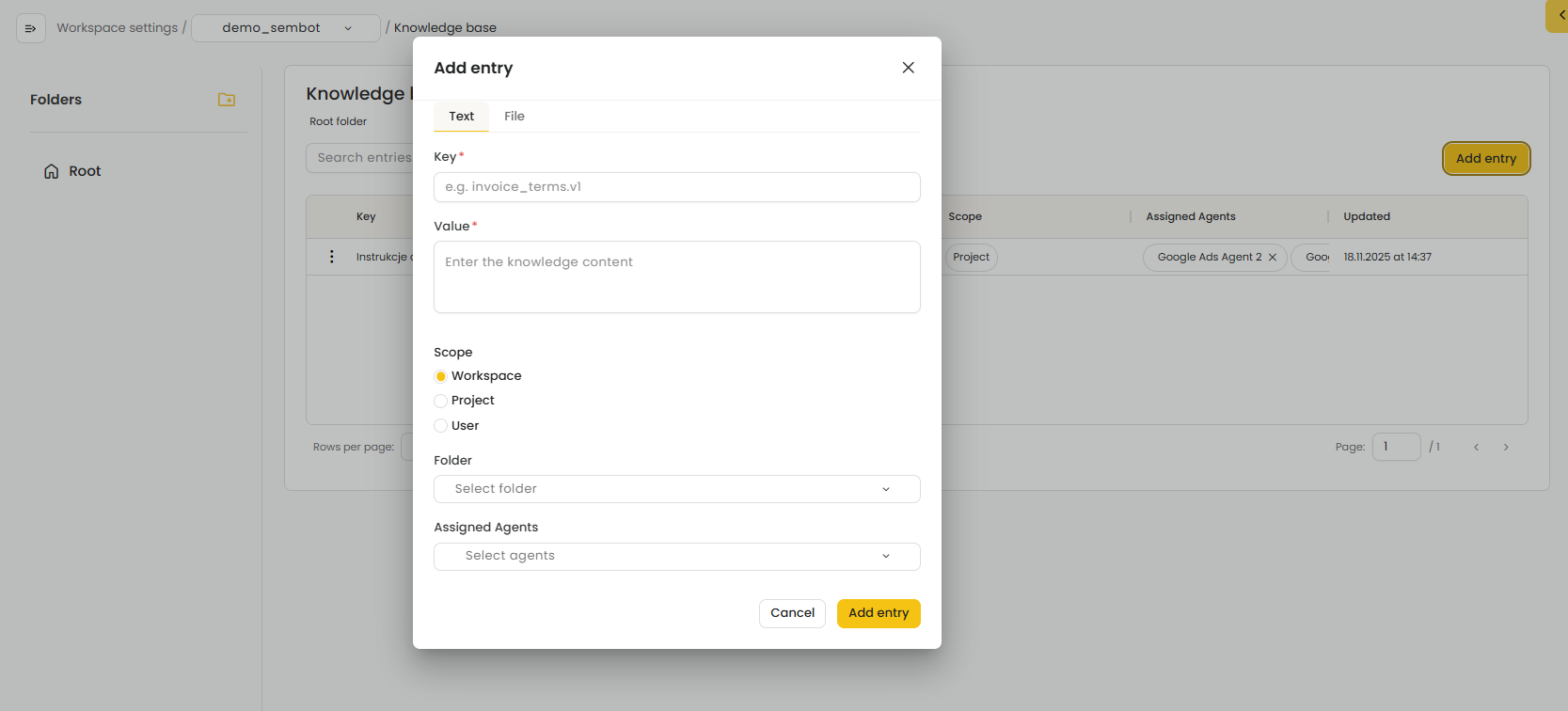 In addition to system agents, users can also create their own agent tailored to the needs of a specific company or project. A custom agent can be designed for a particular context, for example: