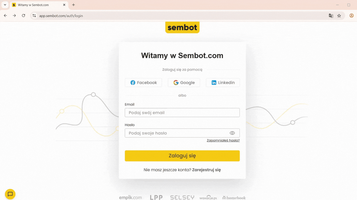 Przejdź na stronę https://app.sembot.com/ i kliknij Zarejestruj się.