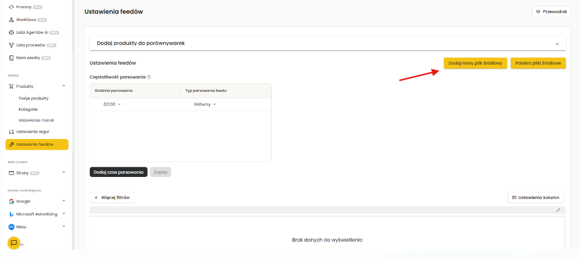 Przejdź do zakładki Ustawienia źródeł i kliknij Dodaj nowy plik źródłowy.