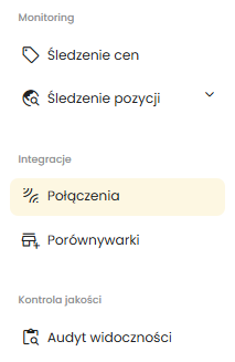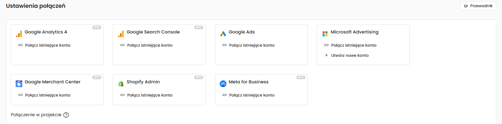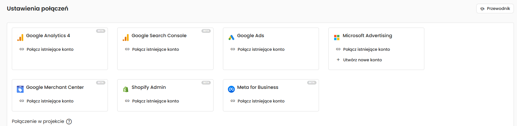 Zakładka connections pozwala na wykonanie połączenia z kontem Google Ads, Microsoft Ads (Bing), Facebook Business, Google Analytics, Google Merchant Center, Google Search Console oraz Shopify.