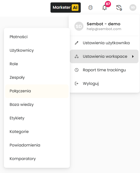 Aby zintegrować projekt z wybranym kanałem pierwszym krokiem, który musisz wykonać jest zrobienie połączenia na poziomie całego konta. Pod znajdującą się w prawym górnym rogu ikoną użytkownika znajduje się zakładka Ustawienia workspace -> Połączenia.
